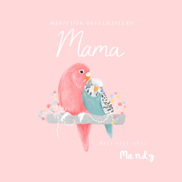 Lieve verjaardagskaart met vogeltjes en aanpasbare naam.