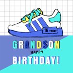 Verjaardagskaart voor een echte sneaker liefhebber. Op de kaart staat: 16 today. Grandson happy birthday!