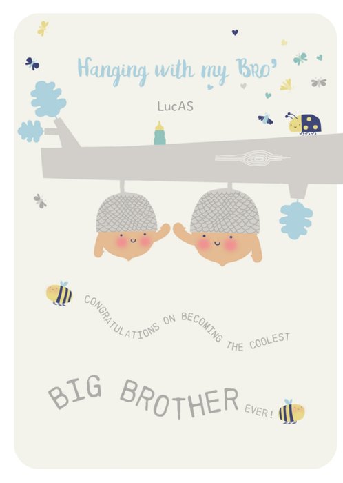 Schattige geboortekaart met aanpasbare naam en de tekst: Hanging with my bro, congratulations on becoming the coolest big brtother ever!
