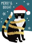 Grappige kerstkaart met een kat met kerstmuts en de tekst: Merry & Bright.