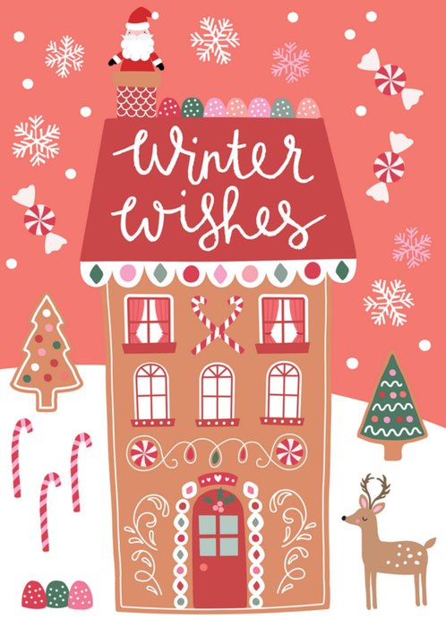 Schattige kerstkaart met een huisje van koek en de tekst: Winter wishes.