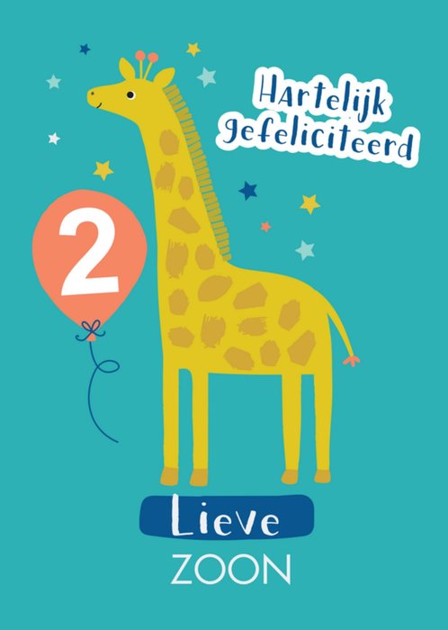 Vrolijke verjaardagskaart met giraf en de tekst: Hartelijk gefeliciteerd lieve zoon.