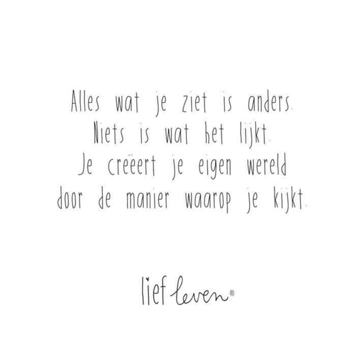 Op deze mooie quote kaart van Lief Leven staat: Alles wat je zier is anders. Niets is wat het lijkt. Je creeert je eigen wereld door de manier waarop je kijkt.