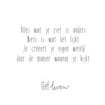 Op deze mooie quote kaart van Lief Leven staat: Alles wat je zier is anders. Niets is wat het lijkt. Je creeert je eigen wereld door de manier waarop je kijkt.