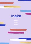 Happy new home kaart met naam. Deze nieuwe woning heeft vrolijke kleuren.