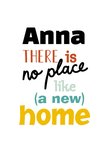 Leuke nieuwe woning kaart met gekleurde tekst en verschillende lettertypes. De naam is aanpasbaar. "There is no place like (a new) home."