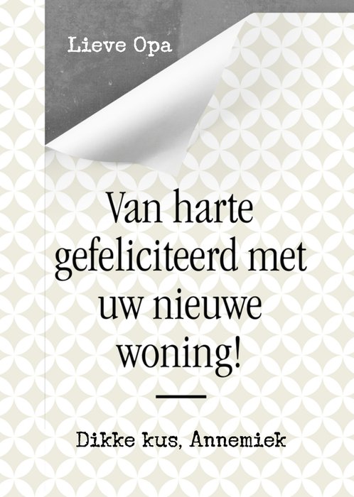 Ken je iemand met een nieuwe stekkie? Stuur dan deze leuke kaart van Luckz om te feliciteren. Op de kaart staat: Van harte gefeliciteerd met uw nieuwe woning! Dikke kus [naam].
