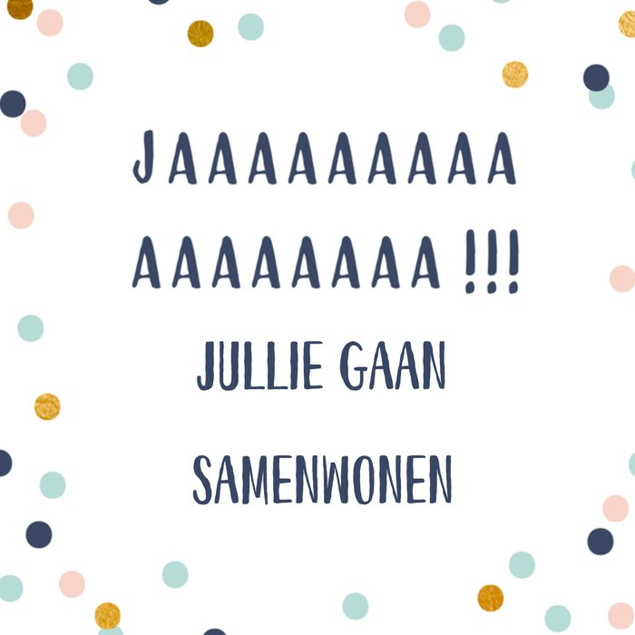 Gaan ze samenwonen? Feliciteer hen doormiddel van deze kaart met deze grote stap! "Jaaaaaa!!! Jullie gaan samenwonen."