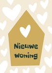 Felicitatiekaart ter gelegenheid van een nieuwe woning met witte hartjes en een vogelhuisje met de tekst: Nieuwe woning.