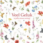 Iemand veel geluk wensen met hun nieuwe woning? Op deze kaart staat de tekst: veel geluk in jullie nieuwe woning! De rest van de kaart is versiert met bloemen en vlinders.