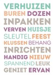 Witte kaart met daarop in verschillende kleuren en lettertypes de woorden: verhuizen, buren, dozen, inpakken, verven, huisje, sleutel, feestje, inrichten en behangen.