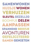 Op deze kaart staan op een witte achtergrond in gekleurde letters de tekst: Samenwonen huisje wonen verhuizen sleutel boompje...en nog veel meer leuke tekst.