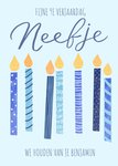 Wat een leuke en vrolijke verjaardagskaart van Okey Dokey Design! De perfecte verjaardagskaart om op te sturen als verrassing. Op deze verjaardagskaart staat: Fijne 9e verjaardag neefje. We houden van je [naam]