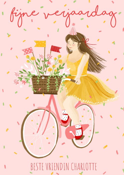 Vrolijke verjaardagskaart met illustratie en aanpasbare naam.