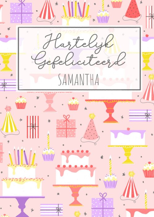 Leuke verjaardagskaart met illustratie en aanpasbare naam.