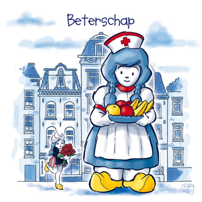 Blauwe beterschapskaart om iemand een hart onder de riem mee te steken van Old Dutch met een boerin die een fruitschaal vast houdt.