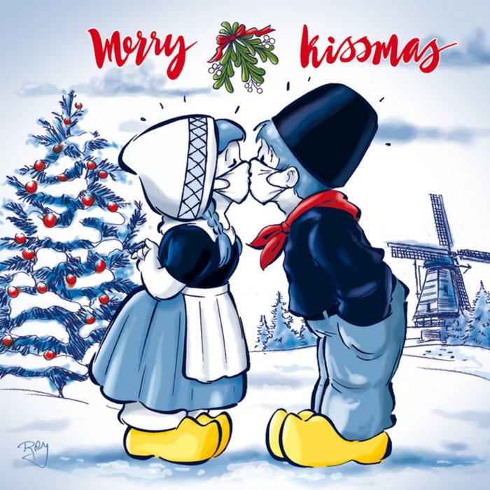 Schattige kerstkaart om iemand een fijne kissmas mee te wensen van Old Dutch waar een oudhollans stel elkaar een kusje probeert te geven met een mondkapje op.