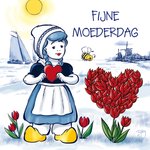 Meisje op de kaart houdt een hart vast en staat tussen de tulpen. Tekst op de kaart 'Fijne moederdag'.