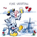 Op deze Delfts blauwe kaart staat een koe afgebeeld met een bierglas in zijn hand. De kaart is afgemaakt met de tekst "Fijne Vaderdag".