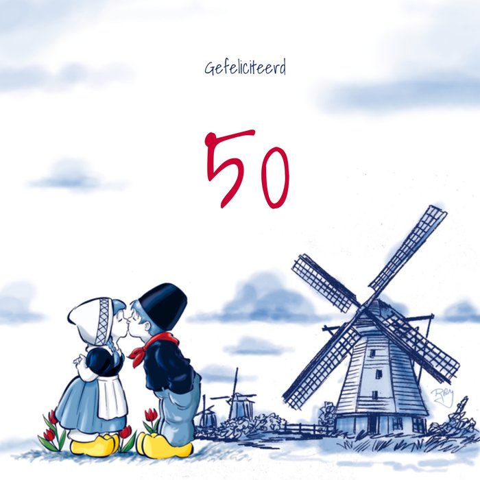 Blauwe verjaardagskaart van Old Dutch met molen.