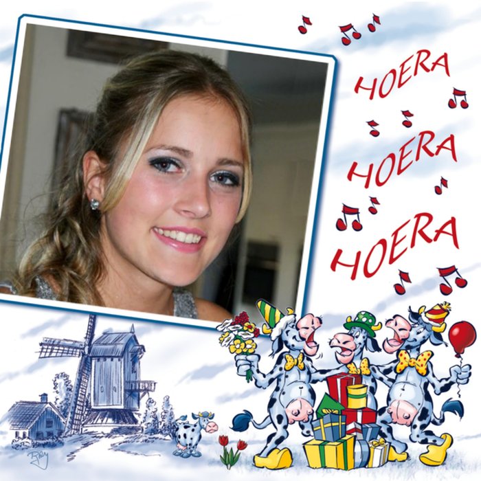 Een leuke verjaardagskaart van Old Dutch waar je een foto aan kan toevoegen. Ook zie je drie koeien die 'hoera' zingen.