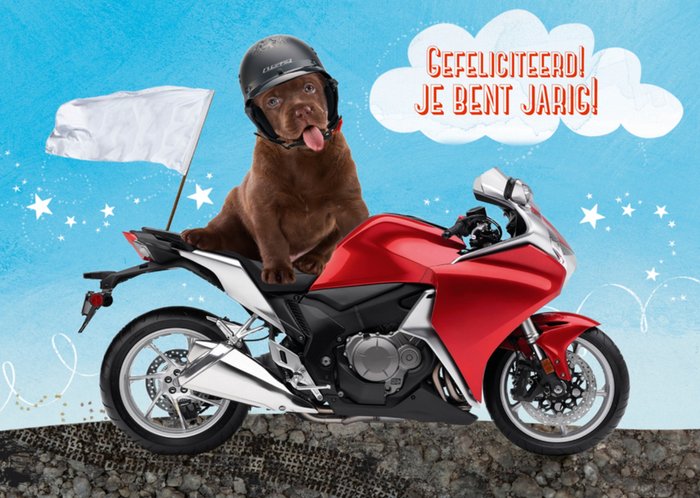 Een leuke Paperclip kaart met een afbeelding van een hond die op een motor stapt.