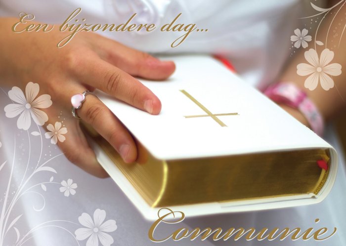 Een leuke kaart speciaal ontworpen voor een communie met erop een meisje die de bijbel vasthoudt.