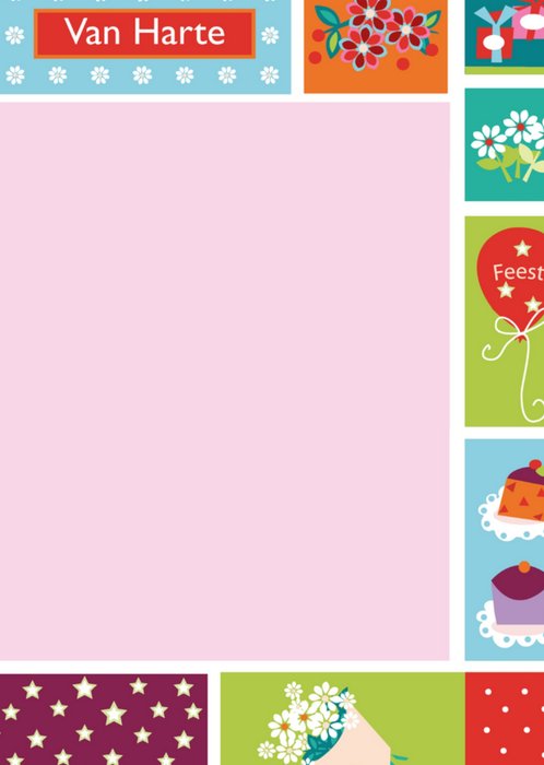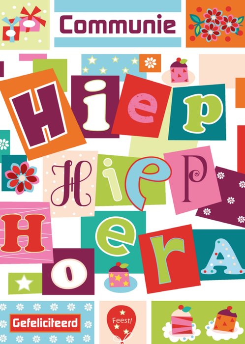 Een vrolijke en kleurrijke kaart speciaal ontworpen voor een communie met verschillende kleuren en met de tekst: Communie Hiep hiep hoera gefeliciteerd.