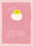 Feliciteer nieuwe ouders met de geboorte van hun dochtertje met deze leuke kaart! Op de kaart staat de tekst "gefeliciteerd met de geboorte van jullie dochter." en een kuikentje die nog half in een eitje zit.