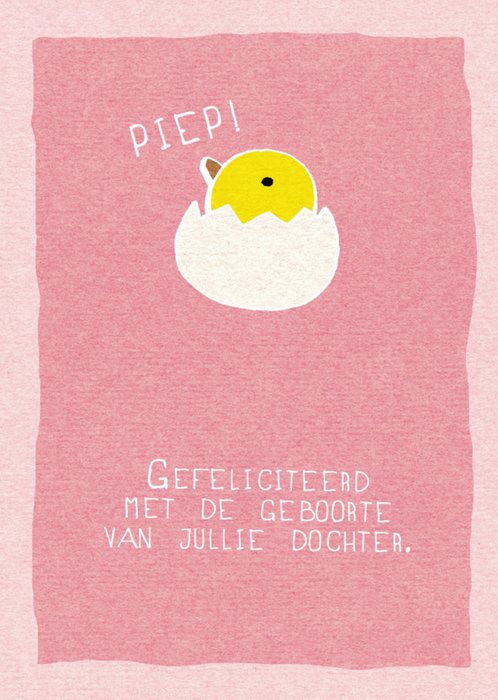 Feliciteer nieuwe ouders met de geboorte van hun dochtertje met deze leuke kaart! Op de kaart staat de tekst "gefeliciteerd met de geboorte van jullie dochter." en een kuikentje die nog half in een eitje zit.