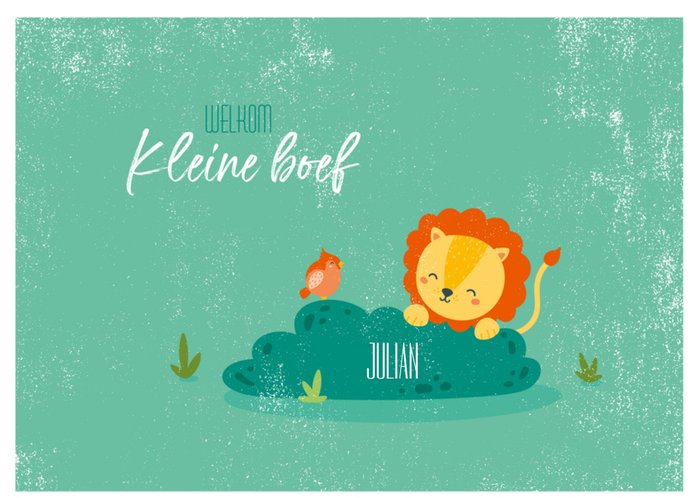 Leuk geboortekaart met een leeuw en de tekst: Welkom kleine boef.