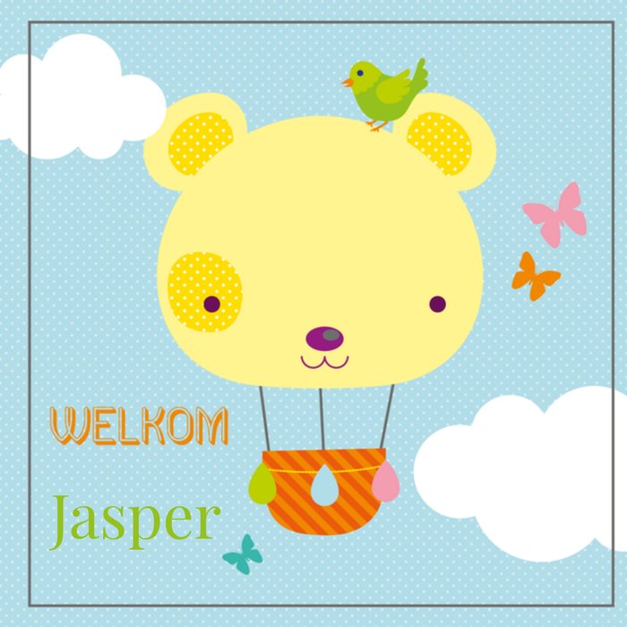 Feliciteer de kersverse ouders met de geboorte van hun kleintje. Op deze lieve kaart zie je een illustratie van een luchtballon. De ballon is in de vorm van een beer. De naam van het kindje kan worden toegevoegd.