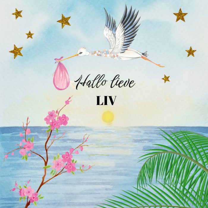 Lieve geboorte kaart van Paperclip met een ooievaar die boven de zee vliegt en op de kaart staat de tekst: Hallo lieve Liv. De naam op de kaart is aanpasbaar.