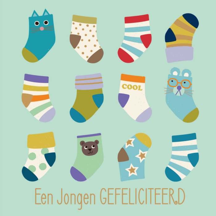 Feliciteer de kersverse ouders met de geboorte van hun kleintje. Op de kaart staan vrolijke gekleurde sokken met de tekst: "Een jongen GEFELICITEERD."
