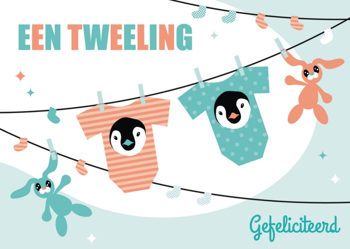 Mingface loves to make people happy”. En dat doen deze kaarten absoluut. De eenvoudige, humoristische karakters en fleurige kleuren ontlokken een glimlach. Ook de binnenzijde is voorzien van verrassende afbeeldingen en teksten. Toch op zoek naar een ander design? Bekijk alle geboortefelicitatiekaartjes.Een tweeling geboren? Feliciteer de kersverse ouders met de geboorte van de twee kleintjes. Op de kaart zie je een waslijn met daaraan kleertjes, knuffeltjes en een baby pinguïn.