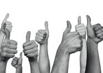Deze witte kaart wordt gevuld met een afbeelding van een zwart-wit afbeelding van handen. Deze handen steken allemaal hun duimen op.