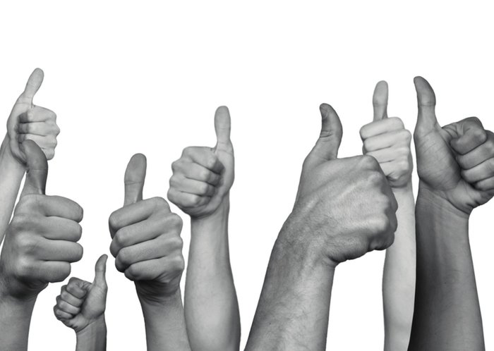 Deze witte kaart wordt gevuld met een afbeelding van een zwart-wit afbeelding van handen. Deze handen steken allemaal hun duimen op.