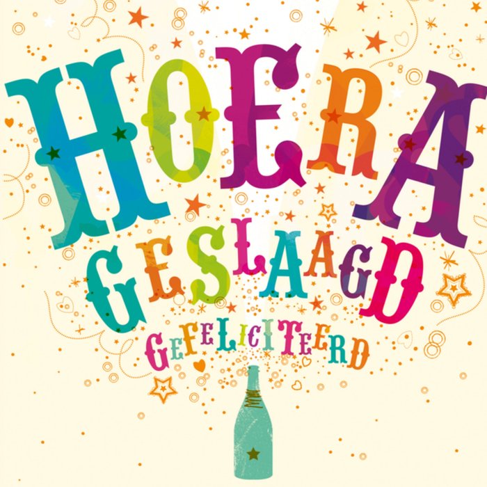 Verras iemand met deze hippe en leuk geslaagdkaarten! Op de kaart zie je met kleurrijke letters: Hoera geslaagd gefeliciteerd geschreven.