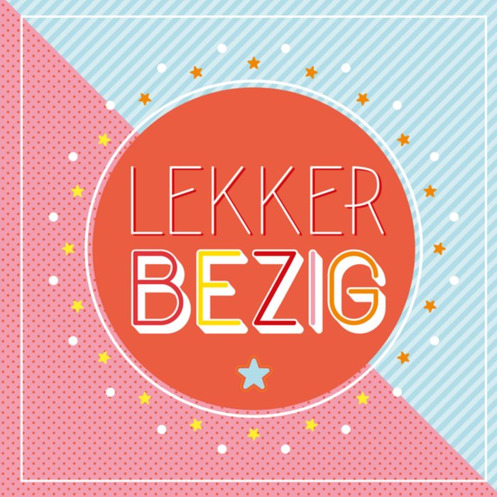 Iemand geslaagd? Feliciteer die persoon dan met deze vrolijke kaart van Paperclip. In het midden van de kaart zit een cirkel met daar omheen kleine sterretjes en stipjes. In de circkel staat de tekst "Lekker bezig".