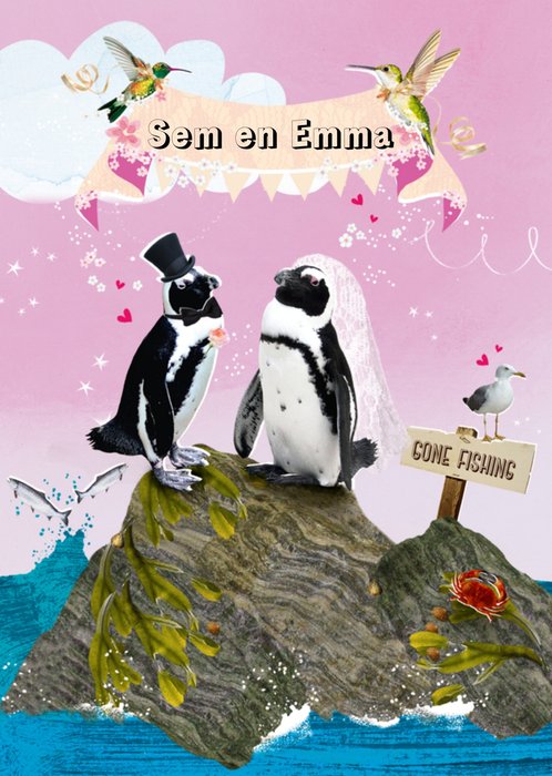 Een super vrolijke en leuke Paperclip kaart met een getrouwde pinguïn koppel afgebeeld. De namen zijn aanpasbaar.
