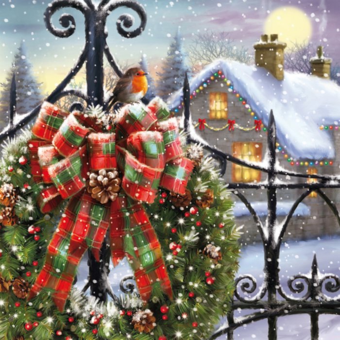 Een leuke kerstkaart om iemand een fijne kerst mee te vieren waarop een plaatje van een huis met kerstversiering is te zien.