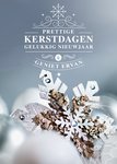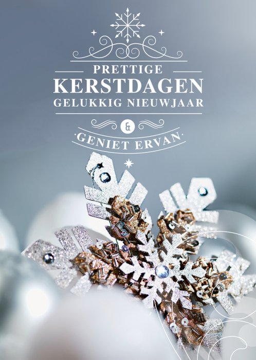 Een mooie kerstkaart met een sneeuwvlokje. In het midden staat in het wit "Prettige kerstdagen gelukkig nieuwjaar" en "Geniet ervan".
