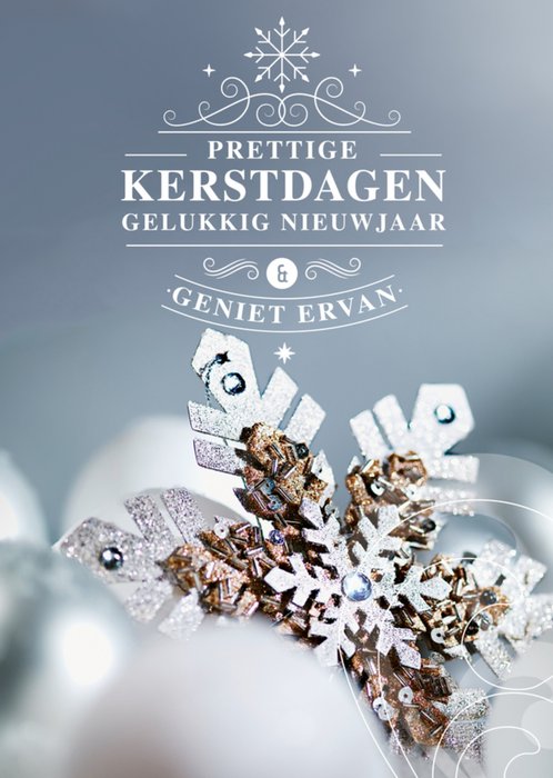 Een mooie kerstkaart met een sneeuwvlokje. In het midden staat in het wit "Prettige kerstdagen gelukkig nieuwjaar" en "Geniet ervan".