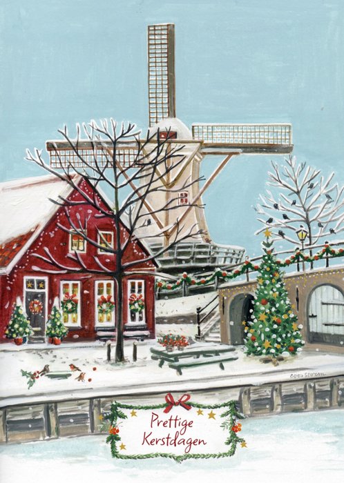 Verras met deze vrolijke kerstkaart met een besneeuwd windmolentafereel.