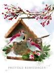Een schattige kerstkaart met twee vogeltjes bij hun besneeuwde vogelhuisje. Boven het huisje hangt een takje met rode besjes.