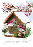 Een schattige kerstkaart met twee vogeltjes bij hun besneeuwde vogelhuisje. Boven het huisje hangt een takje met rode besjes.