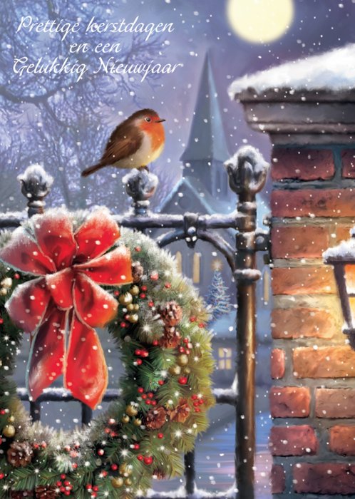 Een leuke kerstkaart waarop een kerstkrans op een hek is afgebeeld met de tekst: Prettige kerstdagen en een gelukkig nieuwjaar.