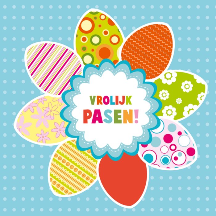 Een leuke, kleurrijke en blauwe kaart speciaal ontworpen voor Pasen met verschillende gekleurde paaseieren.
