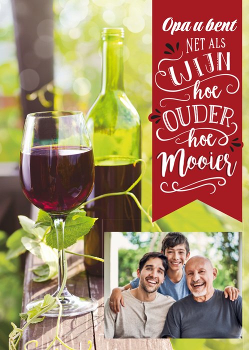 Jij kent iemand die binnenkort jarig is en dat moet natuurlijk gevierd worden! Stuur daarom een feestelijke kaart van Paperclip! Op de kaart staat: Opa u bent net als wijn. Hoe ouder hoe mooier. Je kunt ook een foto toevoegen.
