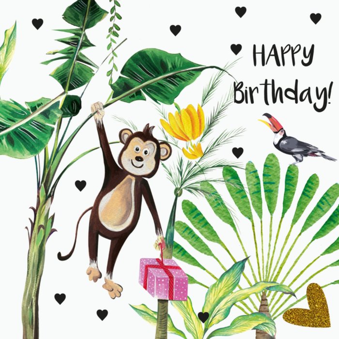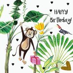 Verjaardagskaart van Paperclip met een schattige aapje op de kaart die een cadeau vasthoudt ook staat de tekst 'Happy Birthday' erop.